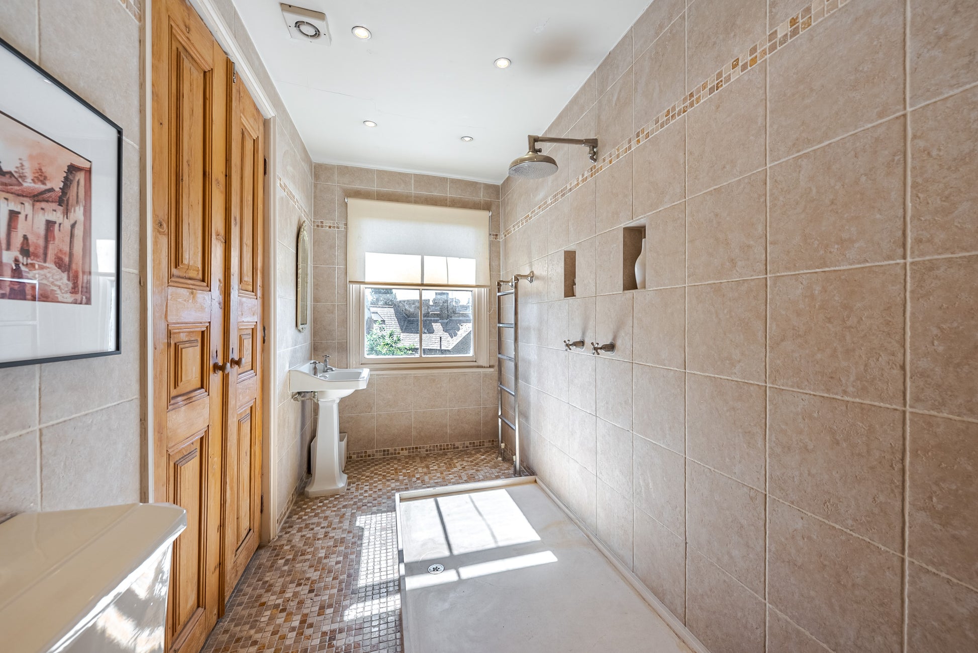 The main reception spaces are anchored by a double-width library room, where floor-to-ceiling wooden bookcases and soft natural light create a cosy, countryside feel rarely found within Zone 1. A relaxed, country-style kitchen with exposed materials and practical detailing further enhances the home’s rustic character, while French doors and large windows ensure the interiors remain bright and shoot-friendly throughout the day.