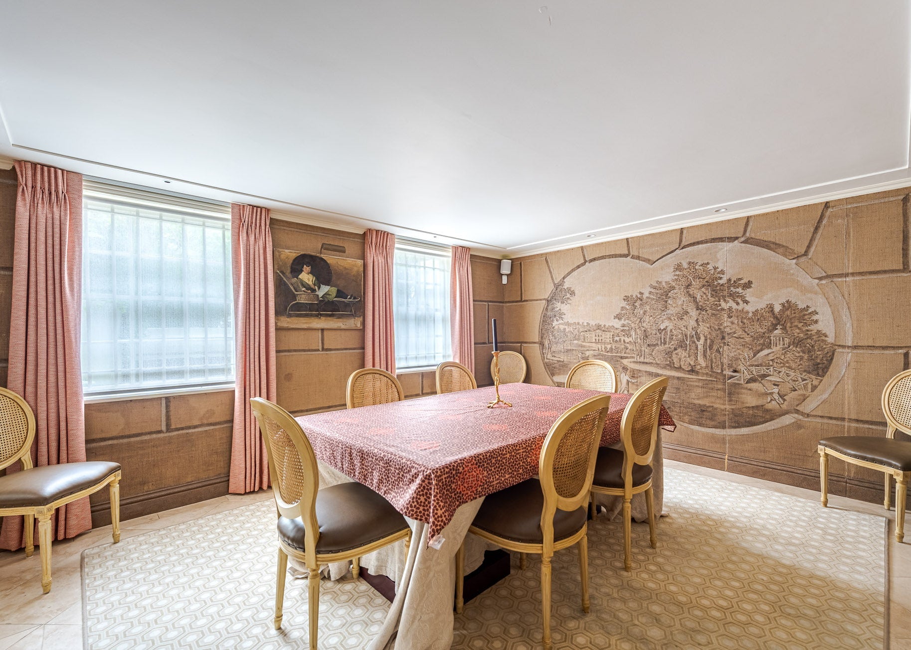 The heart of the house is a bright, open-plan kitchen and dining area, where neutral tones and elegant surfaces sit alongside a striking hand-painted dining room by Ashley Hicks, offering both calm and creative visual energy. A bold red bathroom and cosy sitting rooms bring pops of colour and personality, while subtle textures and material contrasts add depth and nuance to every frame.