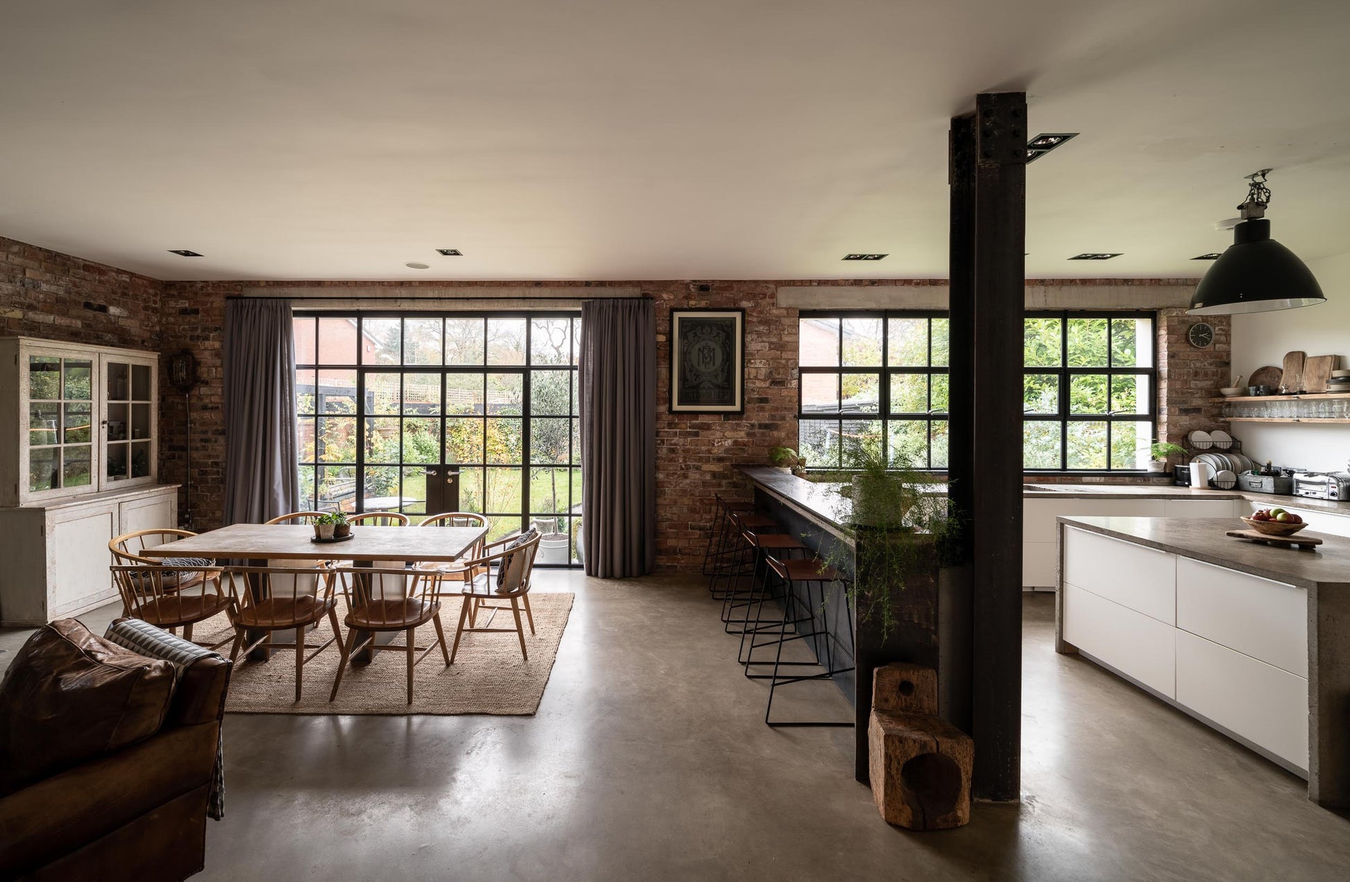 This period property in Harborne, Birmingham combines character with a dark, industrial‑inspired interior, making it ideal for lifestyle, editorial and commercial shoots. Exposed brick, concrete floors, steel columns and dark timber panelling create a dramatic, textured backdrop, complemented by large Crittall‑style windows that flood the space with natural light.